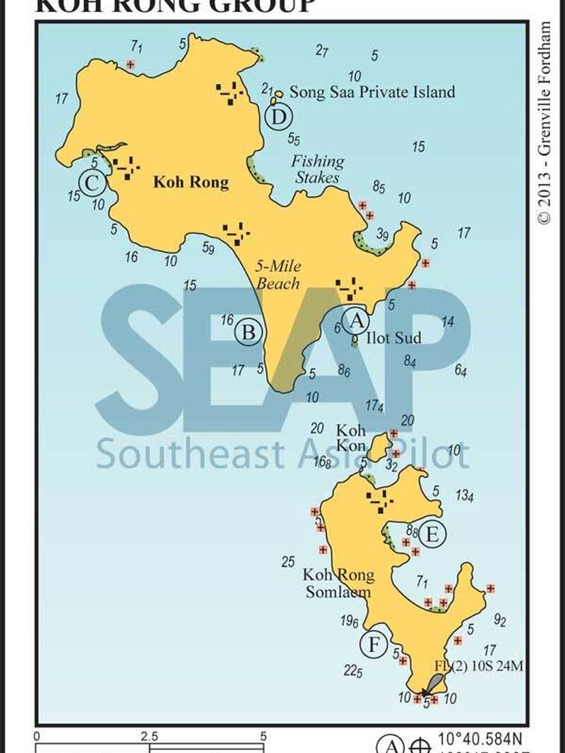 Koh Rong Sanloem is a renowned destination for leisure sailing in Southeast Asia, and the SEAPilot lists [map above] the anchorage points available around the island.