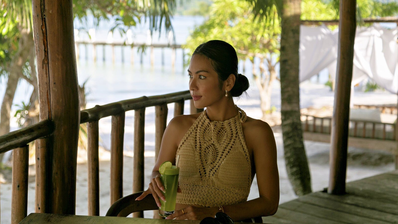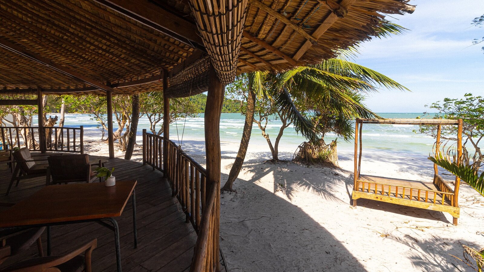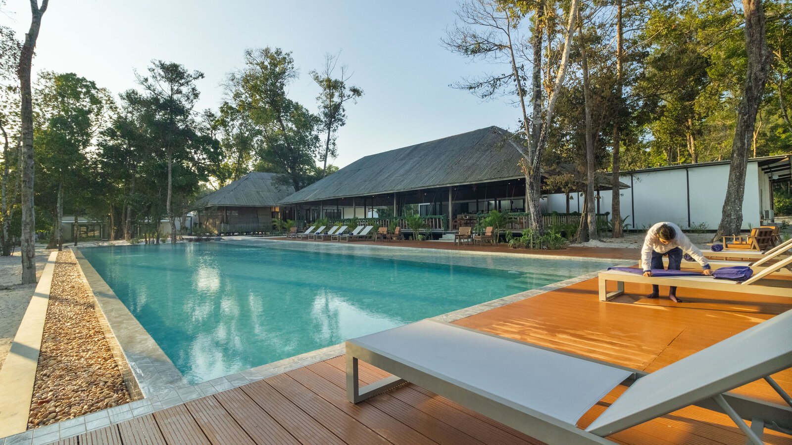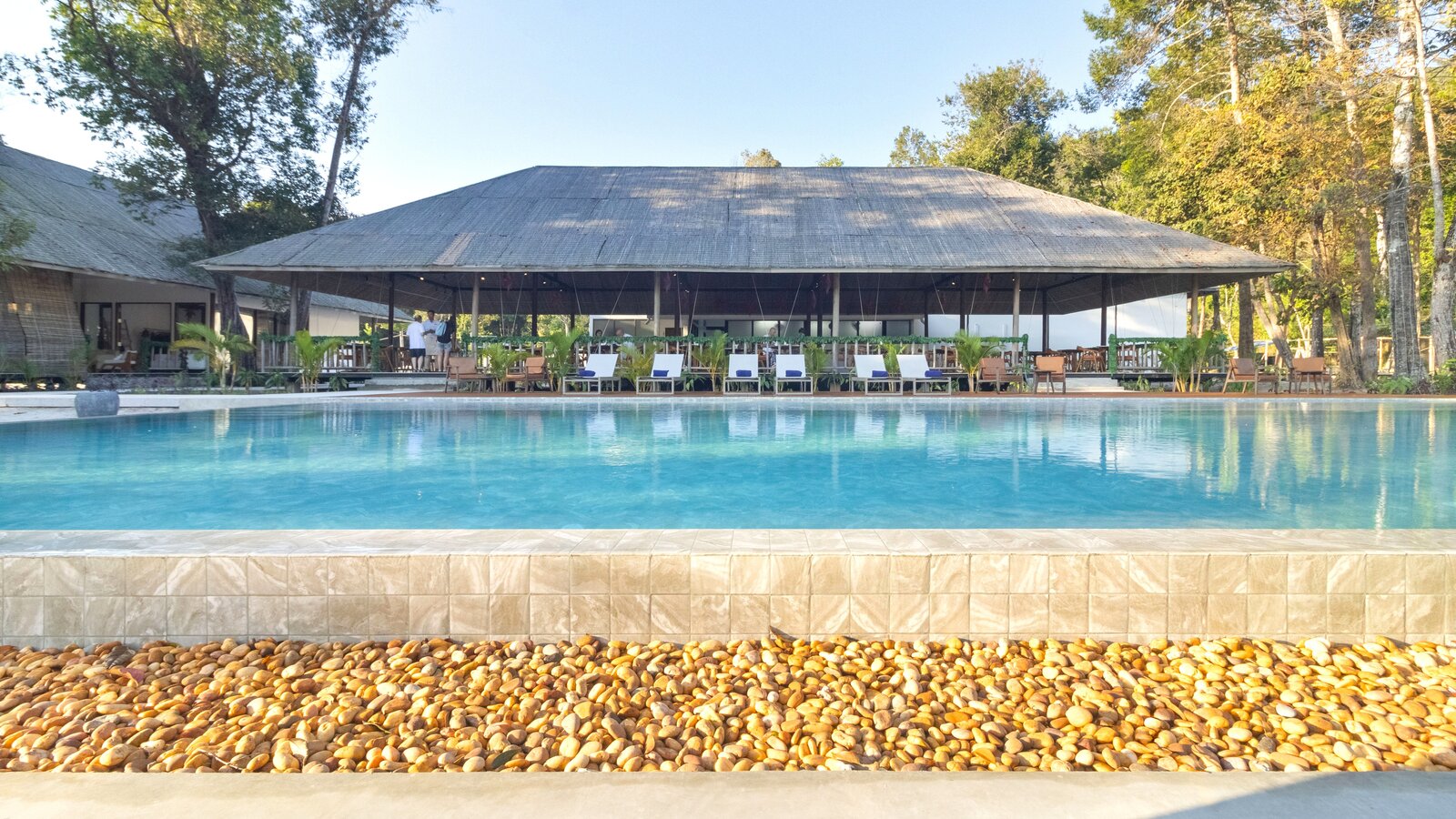 Stretching over the tree-shaded beach, the 25 m-long infinity pool has two depths on its 11-m width, one (1.3 m) for lap-swimming, the other (0.20 m) for lounging in the translucid water.
