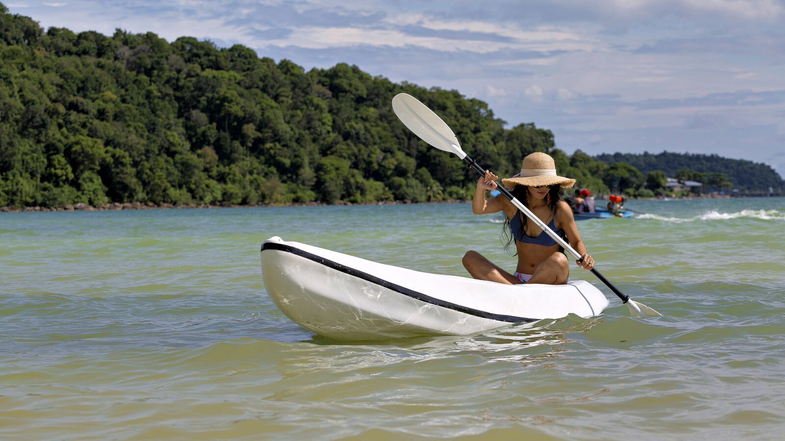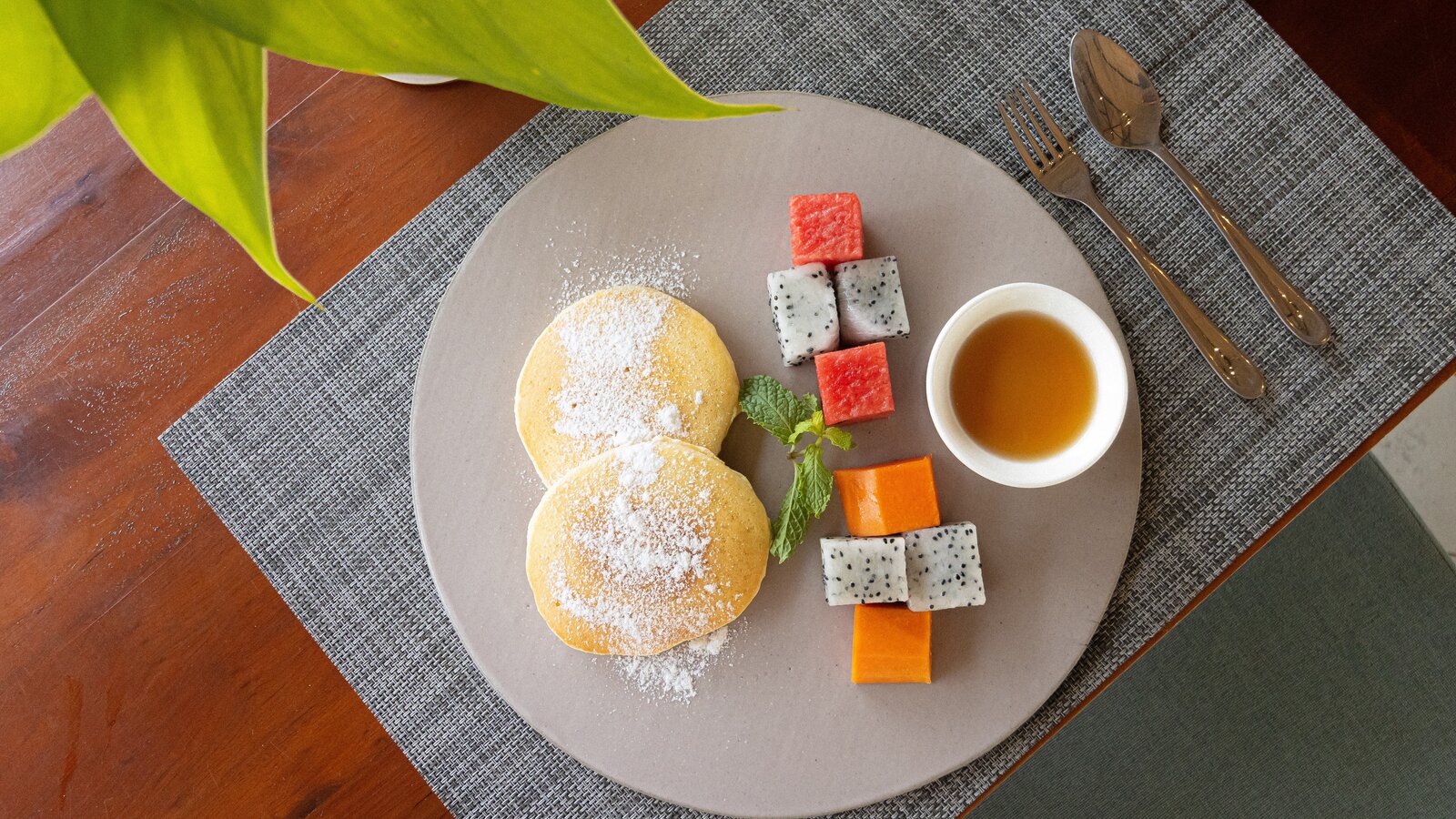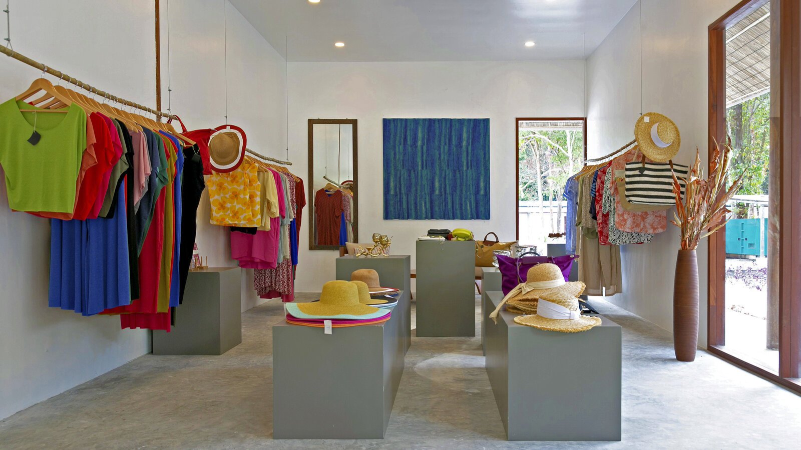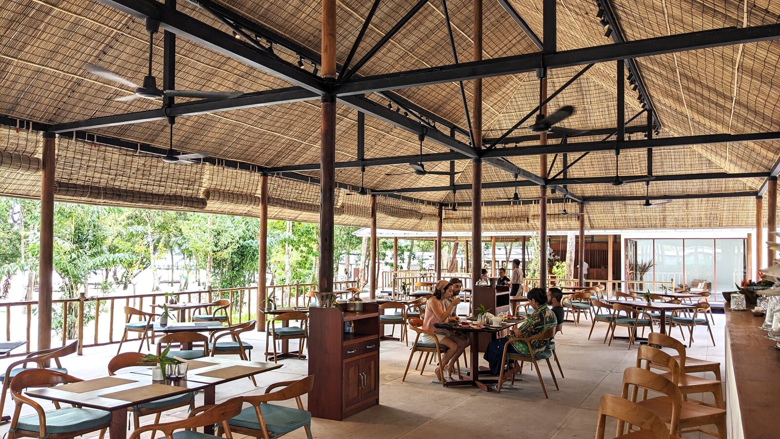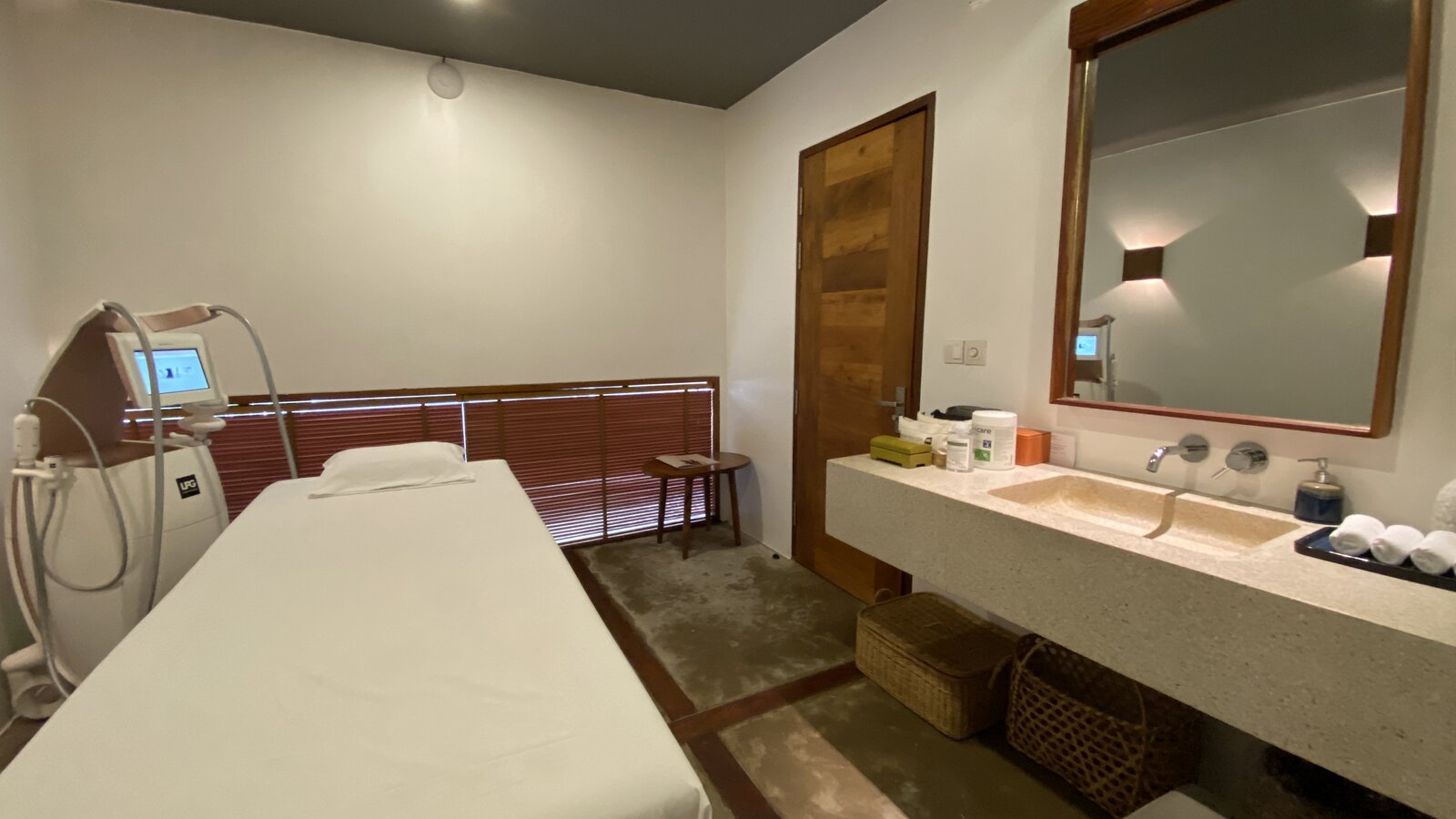 Stretching over the tree-shaded beach, the 25 m-long infinity pool has two depths on its 11-m width, one (1.3 m) for lap-swimming, the other (0.20 m) for lounging in the translucid water.