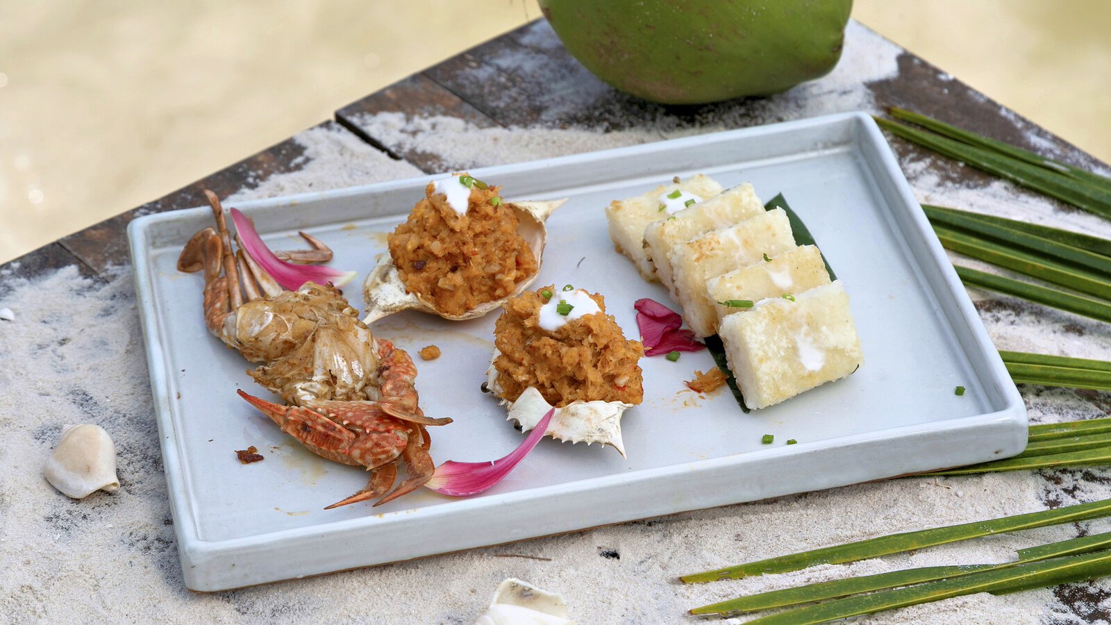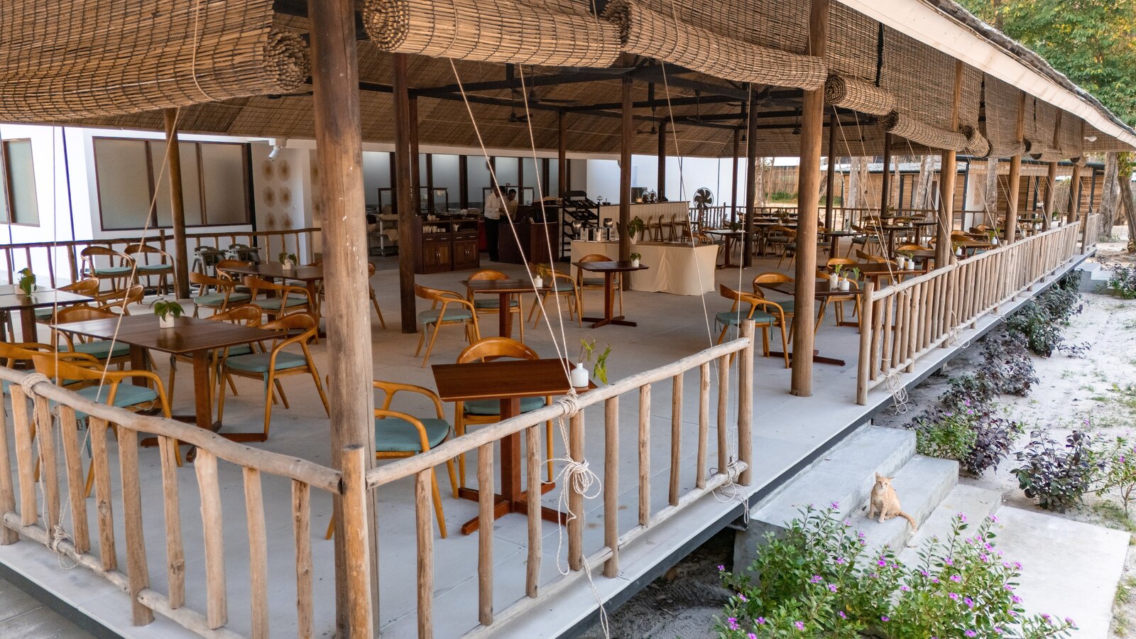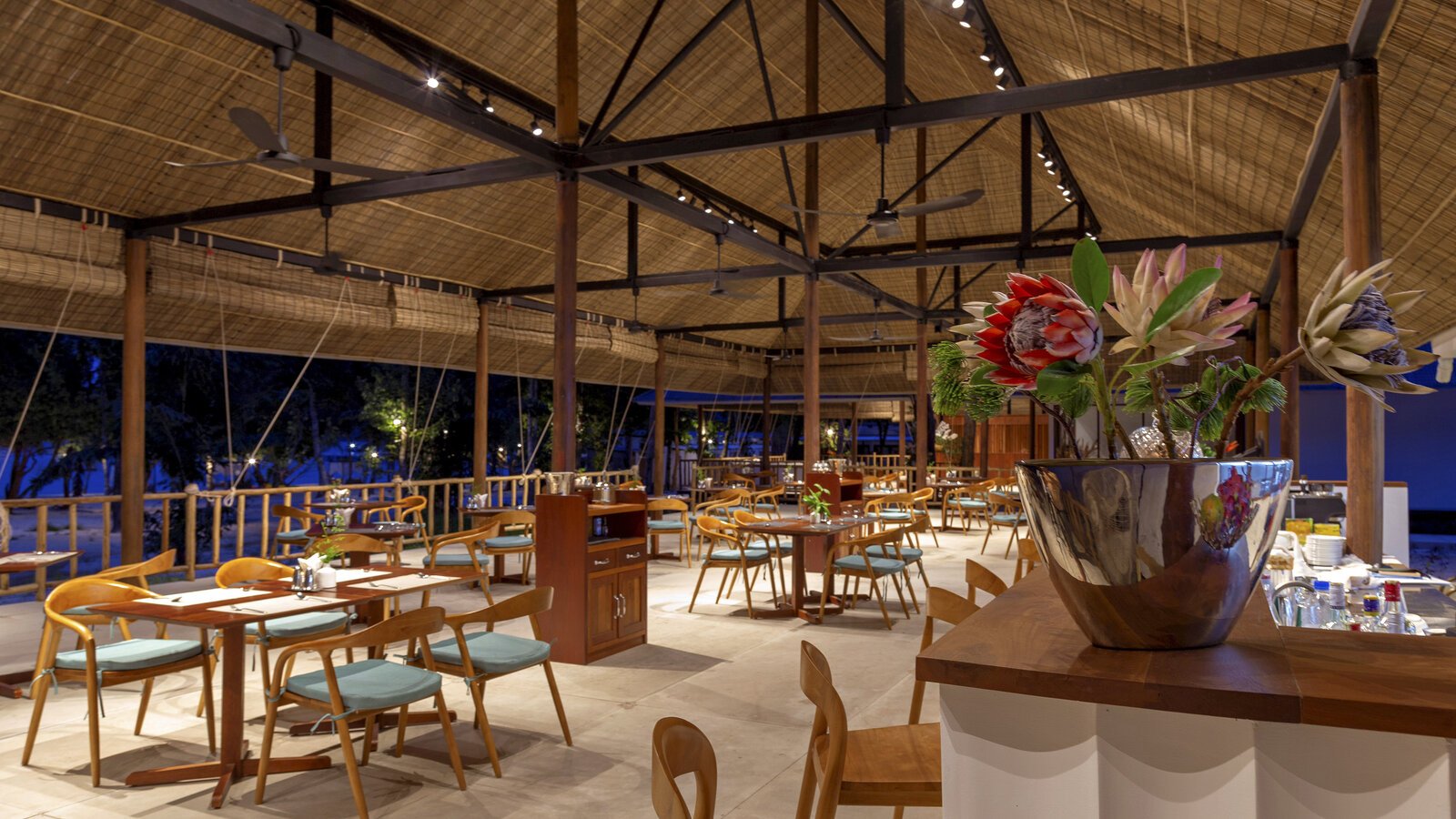 Ceramic-tiled, the basin catches the natural light from the sky and the nearby ocean. Main restaurant-lounge a few steps away from the deck with sunbeds and chairs.