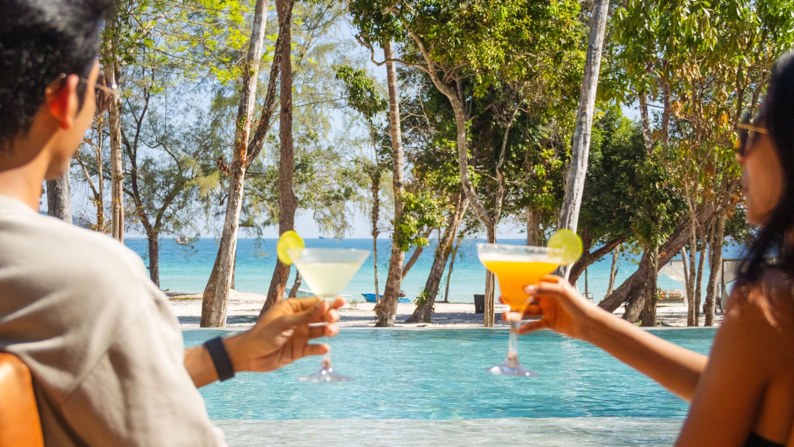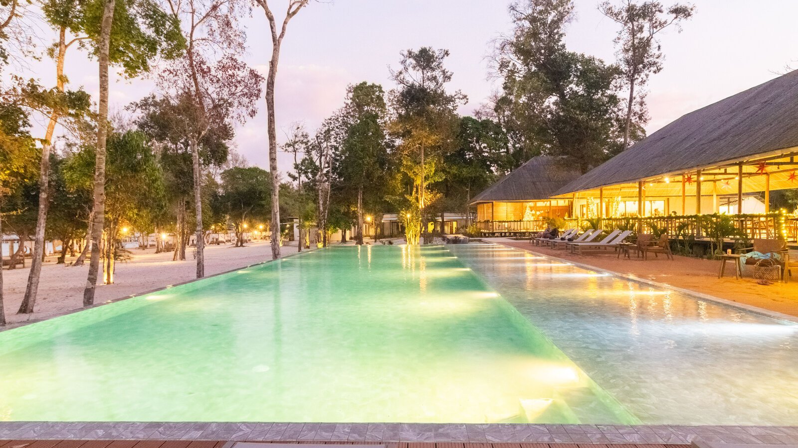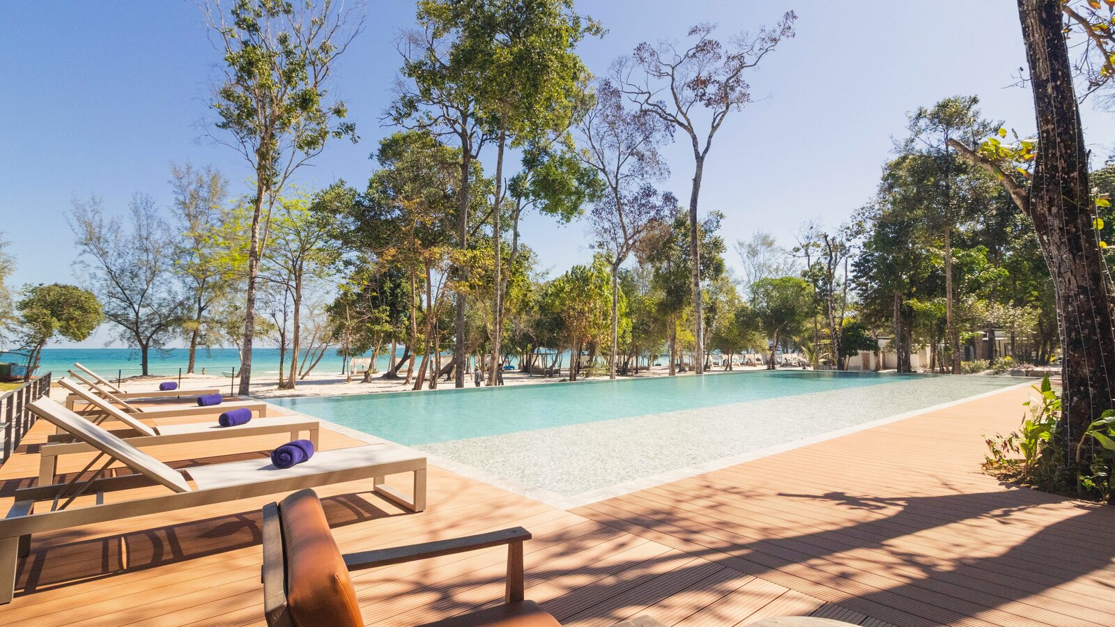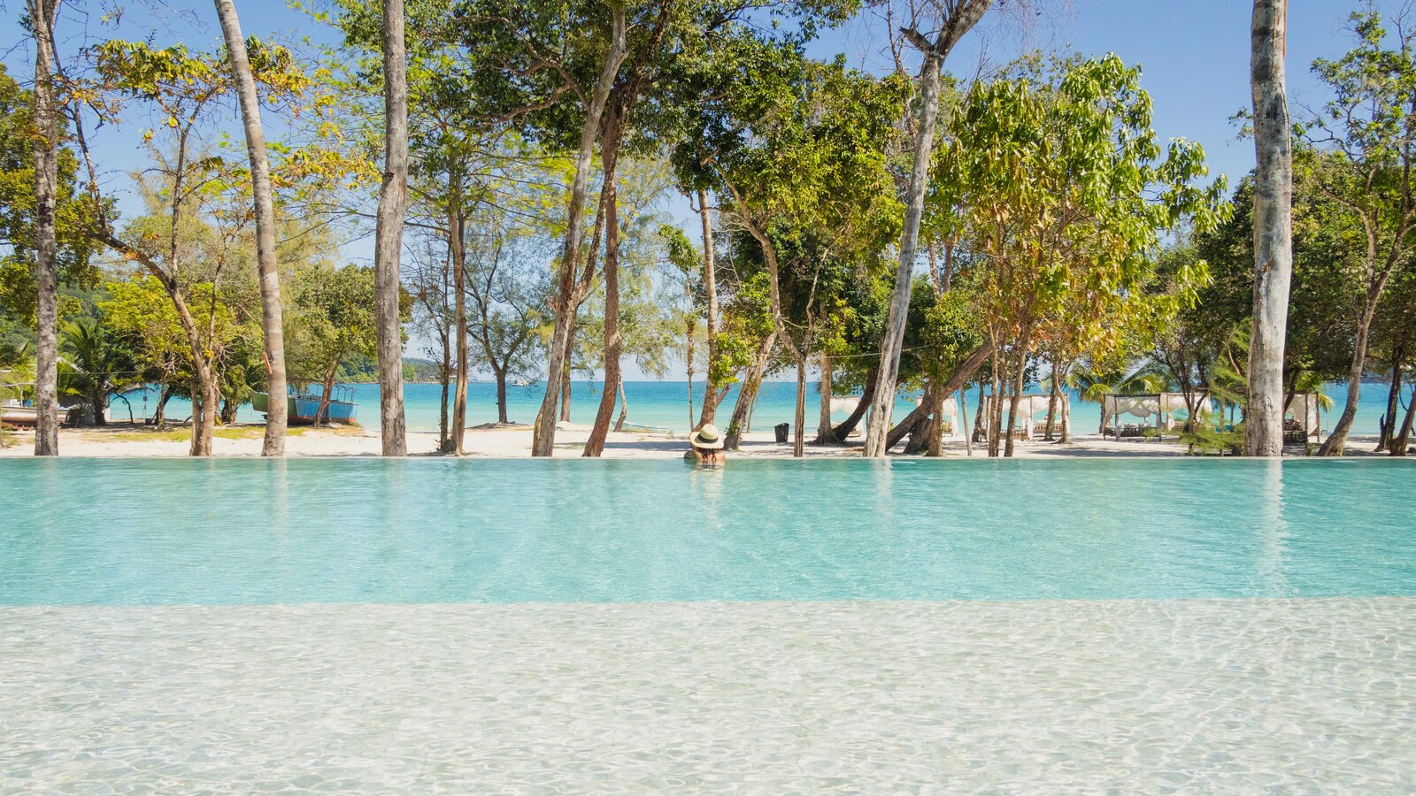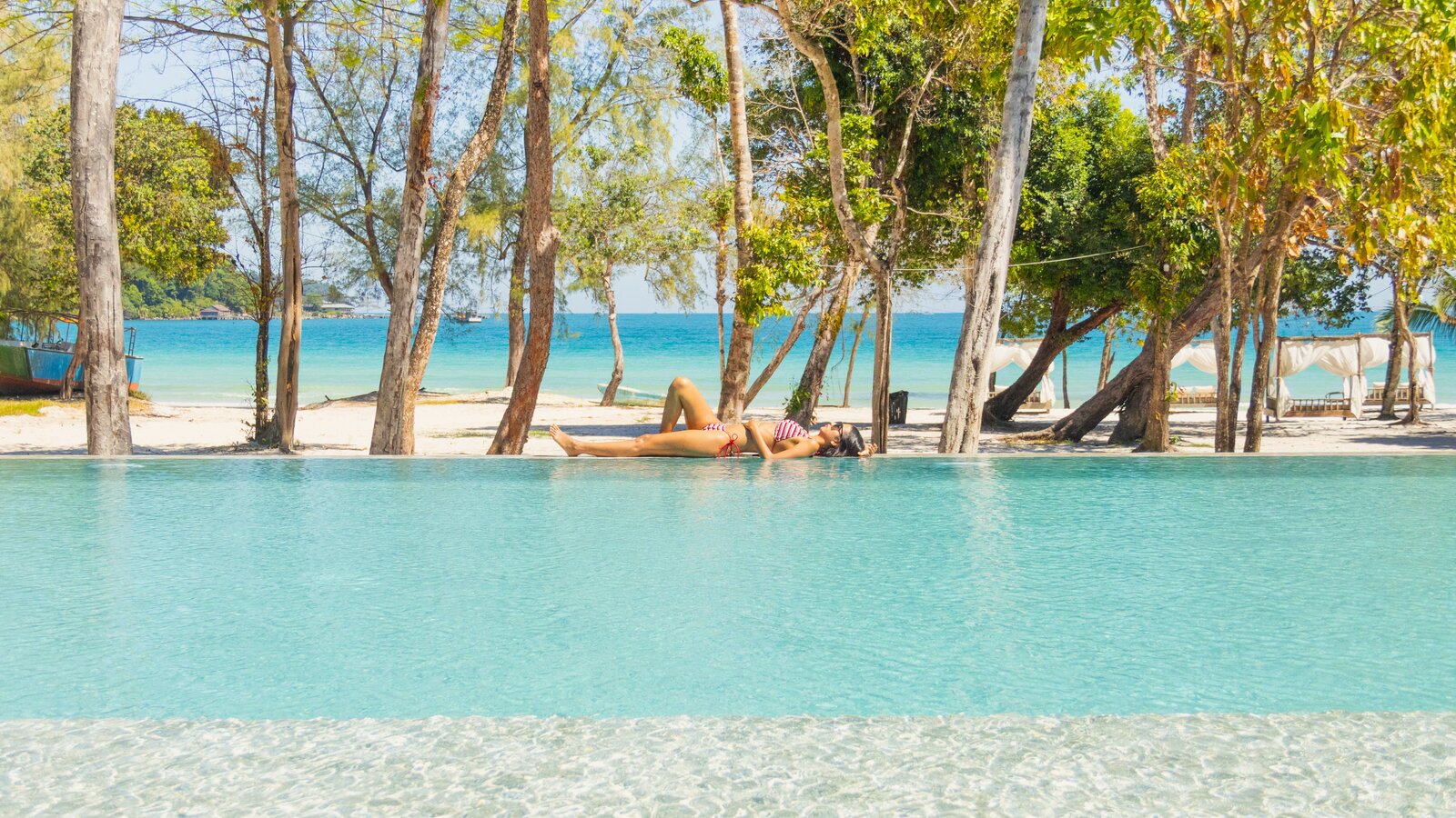 Mirroring the sky and nearby sea, a pool for swimming and lounging right on the white sandy beach.